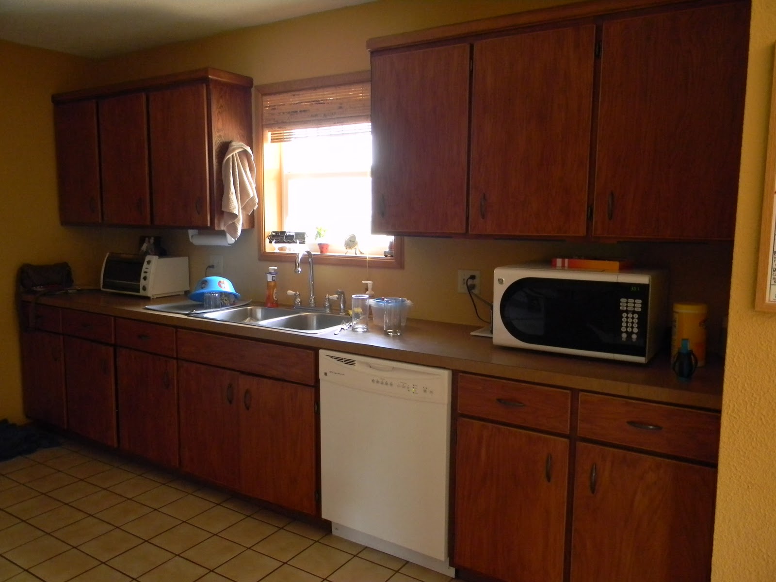 I refinished all the kitchen cabinets, after 5 years of John Deere green I finally did it! All.By.Myself! (and it is a huge kitchen, almost too big, I know...who says their kitchen is too big? but honestly, it's 13 feet across from my stove to my sink, 17 feet from one wall to another in the last picture (the sink wall), really, it's huge! 30 cabinet doors and 9 drawers and the fold out thing under the sink!)